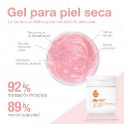 Su catálogo también cuenta con soluciones para la piel seca, en envases de 200 ml, 100 ml o 50 ml. ¿Qué ocurre cuando vertemos agua y aceite en un vaso? Que el aceite asciende a la superficie y evita la evaporación del agua. Pues así es como la piel preserva la humedad, del mismo modo: mediante una barrera lipídica invisible en la superficie. Los tratamientos para la piel seca de Bio-Oil actúan complementando la función de esta barrera. Y mientras que los productos tradicionales como cremas, lociones y mantecas contienen de media un 20% de aceite, cera o manteca, los de Bio-Oil contienen un 84%.