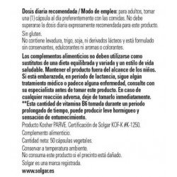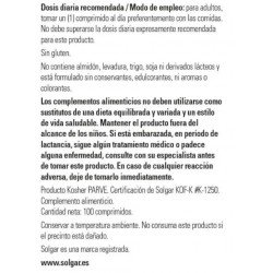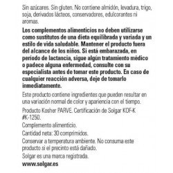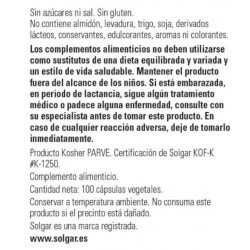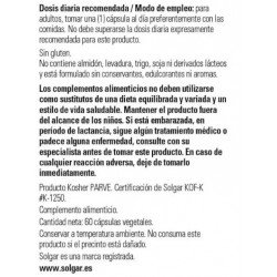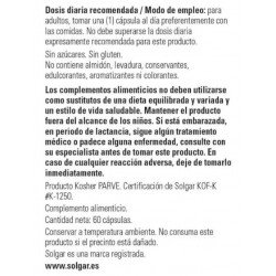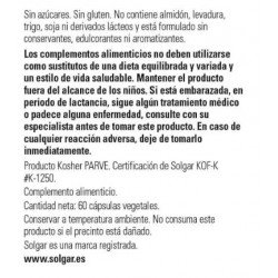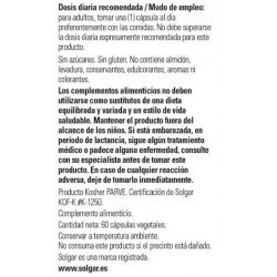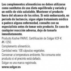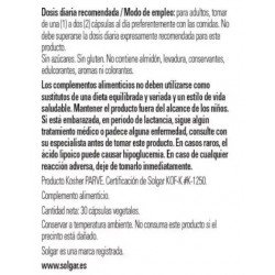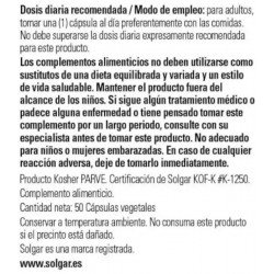 Todos los productos de Solgar han sido elaborados bajo estrictos controles de calidad y con la supervisión de profesionales de la nutrición. Los complementos alimenticios de Solgar tienen un buen precio en la parafarmacia online de Pharmayes y son fáciles de tomar gracias a su formato en cápsulas. Hay que tener en cuenta que los complementos alimenticios no son en ningún caso sustitutivos de una dieta variada y equilibrada rica en todo tipo de alimentos como los cereales, las frutas, las verduras, las hortalizas, los pescados y las carnes. Llevar a cabo una alimentación variada es primordial para mantener el organismo en perfecto estado de forma.